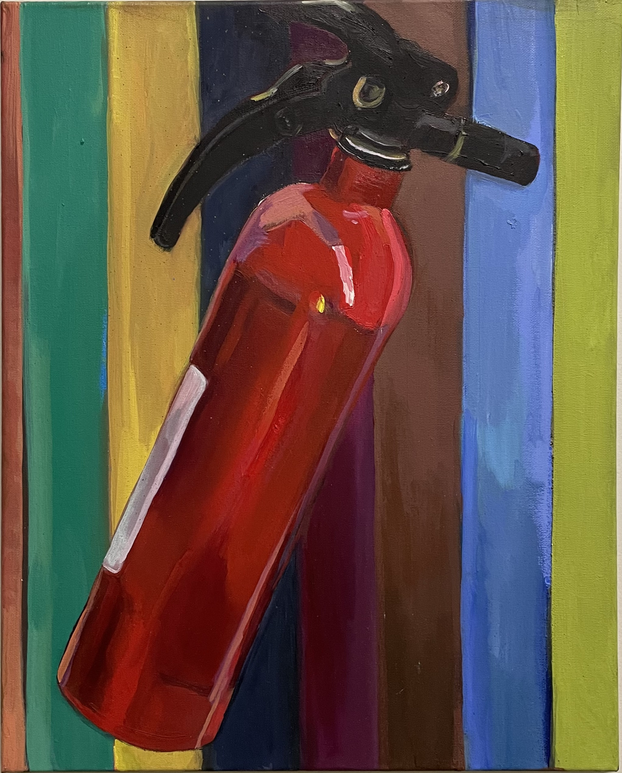 “Stripes and Fire Extinguisher,” Oil on canvas, 20 x 24, 2021
